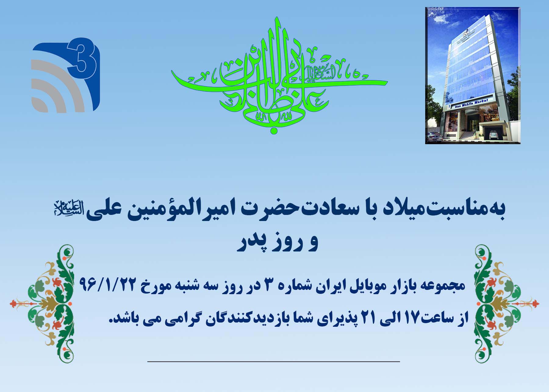 ساعات کار مجموعه بازار موبایل ایران شماره 3 در روز میلاد حضرت امیر المؤمنین علی (ع) و روز پدر